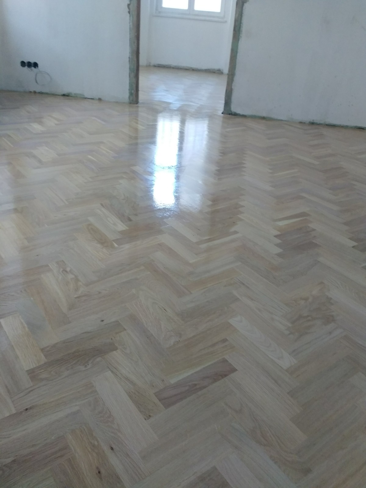 Před samotnou pokládkou podlahy z dřevných parket bylo nutné připravit podklad na které se parkety lepily. Jako podklad pro dřevěné parkety byly zvolené dvě vrstvy OSB desek lepené a pro-šroubované do kříže položené na dřevěném roštu. Po nalepení parket následovalo broušení a lakování.